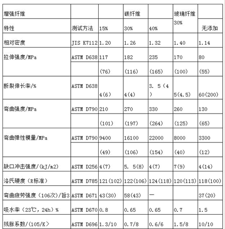 根據碳纖維長度、表面處理方式及用量的不同,還可以制備綜合性能優異、導電性能各異的導電材料,如抗靜電材料、電磁屏蔽材料、面狀發熱體材料、電極材料等。碳纖維增強尼龍材料近年來發展很快,因為尼龍和碳纖維都是各自領域性能優異的材料,其復合材料綜合體現了二者的優越性,強度與剛性比未增強的尼龍高很多,高溫蠕變小,熱穩定性顯著提高,尺寸精度好,耐磨,阻尼性優良,與玻纖增強尼龍相比有更好的綜合性能,如表所示。